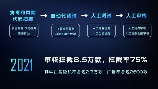 vivo应用商店拥有一套完善和严格的入库审测流程,每个APP需经过病毒和风险代码扫描、自动化测试、人工深度测试、人工资质和信息审核共四道审测程序,方能上架。数据显示,今年以来,vivo应用商店已审核拦截8.5万款不合规APP,拦截率超75%。